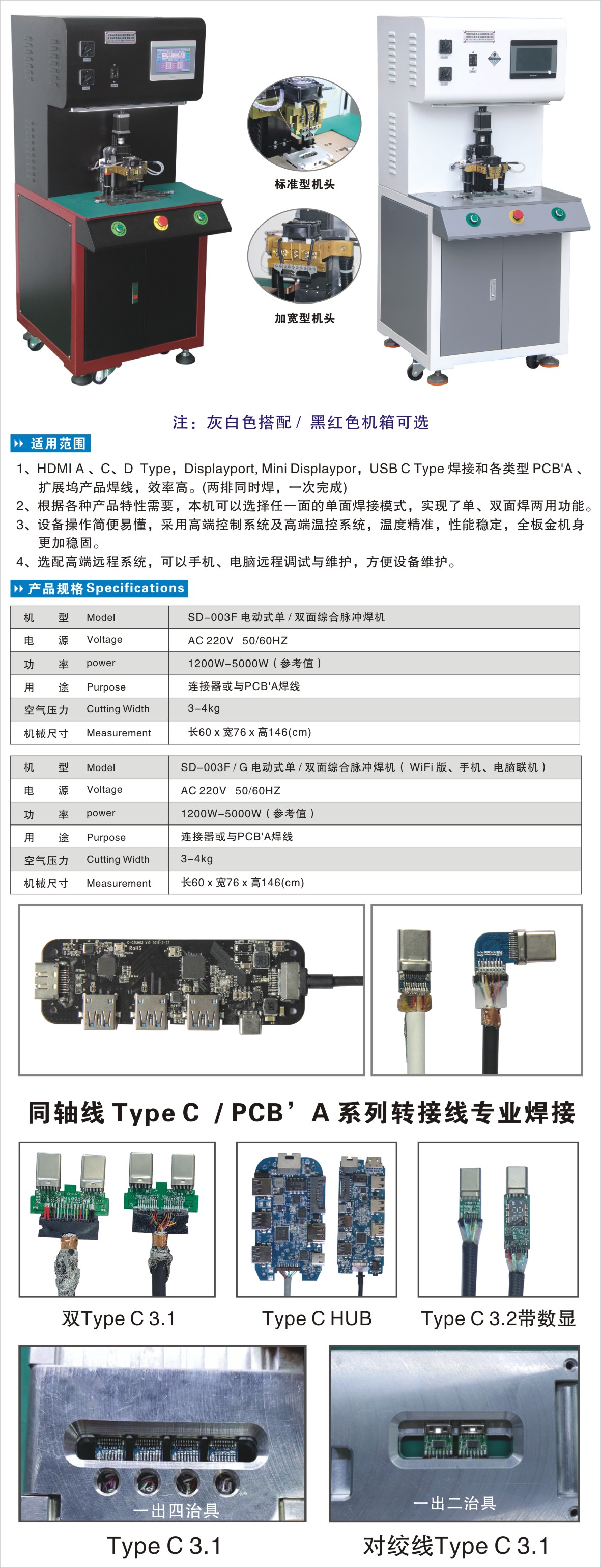 1、HDMI A 、C、D Type,Displayport, Mini Displaypor,USB C Type 焊接和各類型 PCB'A 焊線等,效率高。(兩排同時(shí)焊,一次完成)