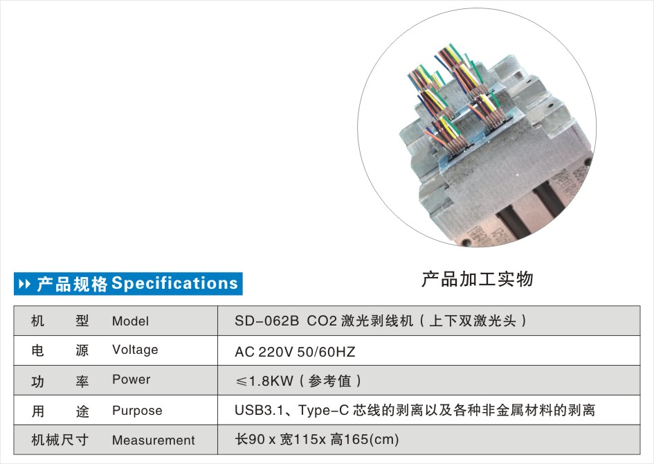 ◎ CO 2 激光剝線機(jī)應(yīng)用于針對(duì) USB3.1、Type C 芯線的剝離,以及各種非金屬材料的剝離。